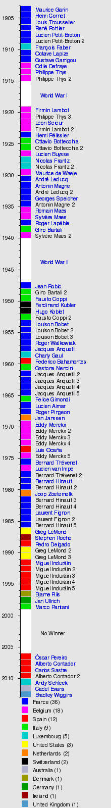 | 13 (1993–1996, 1999–2005, 2009–2010) | 1 (1995) | Lance Armstrong | |
