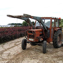 The most common variation of the classic farm tractor is the hoe, also called a hoe-loader. As the name implies, it has a loader assembly on the front and a backhoe on the back. Backhoes attach to a three-point hitch on farm or industrial tractors. Industrial tractors are often heavier in construction, particularly with regards to the use of steel grill for protection from rocks and the use of construction tires. When the backhoe is permanently attached, the machine usually has a seat that can swivel to the rear to face the hoe controls. Removable backhoe attachments almost always have a separate seat on the attachment.