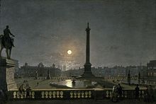 From 1732, the King's Mews were divided into the Great Mews and the smaller Green Mews to the north by the Crown Stables, a large block, built to the designs of William Kent. Its site is now occupied by the National Gallery. The Royal Mews were transferred to Pimlico in the 1820s, and the stable block used as a menagerie, and for the storage of public records, until its demolition in 1835. In 1826 the Commissioners of H.M. Woods, Forests and Land Revenues instructed John Nash to draw up plans for clearing a large area south of Kent’s stable block, and as far east as St Martin’s Lane. His plans left open the whole area of what was to become Trafalgar Square, except for a block in the centre, which he reserved for a new building for the Royal Academy. They also involved the demolition and redevelopment of an area of buildings between St Martin’s Lane and the Strand, and the construction of a road (now called Duncannon Street) across the churchyard of St Martin-in-the-Fields. The Charing Cross Act was passed in 1826 and clearance of the ground started soon after.