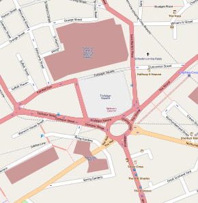 The square consists of a large central area with roadways on three sides, and a terrace to the north, in front of the National Gallery. The roads around the square form part of the A4 road.The square was formerly surrounded by a one-way traffic system, but works completed in 2003 reduced the width of the roads and closed the northern side to traffic.