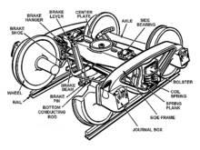 A bogie (pron.: / ˈ b oʊ ɡ i / BOH-ghee) is a wheeled wagon or trolley. In mechanics terms, a bogie is a chassis or framework carrying wheels, attached to a vehicle. It can be fixed in place, as on a cargo truck, mounted on a swivel, as on a railway carriage or locomotive, or sprung as in the suspension of a caterpillar tracked vehicle.