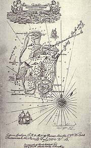 | “ | ... busy with a box of paints I happened to be tinting a map of an island I had drawn. Stevenson came in as I was finishing it, and with his affectionate interest in everything I was doing, leaned over my shoulder, and was soon elaborating the map and naming it. I shall never forget the thrill of Skeleton Island, Spyglass Hill, nor the heart-stirring climax of the three red crosses! And the greater climax still when he wrote down the words "Treasure Island" at the top right-hand corner! And he seemed to know so much about it too — the pirates, the buried treasure, the man who had been marooned on the island ... . "Oh, for a story about it", I exclaimed. ... . | ” |