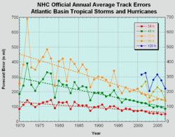 Because of the forces that affect tropical cyclone tracks, accurate track predictions depend on determining the position and strength of high- and low-pressure areas, and predicting how those areas will change during the life of a tropical system. The deep layer mean flow, or average wind through the depth of the troposphere, is considered the best tool in determining track direction and speed. If storms are significantly sheared, use of wind speed measurements at a lower altitude, such as at the 700 hPa pressure surface (3,000 metres/9,800 feet above sea level) will produce better predictions. Tropical forecasters also consider smoothing out short-term wobbles of the storm as it allows them to determine a more accurate long-term trajectory. High-speed computers and sophisticated simulation software allow forecasters to produce computer models that predict tropical cyclone tracks based on the future position and strength of high- and low-pressure systems. Combining forecast models with increased understanding of the forces that act on tropical cyclones, as well as with a wealth of data from Earth-orbiting satellites and other sensors, scientists have increased the accuracy of track forecasts over recent decades. However, scientists are not as skillful at predicting the intensity of tropical cyclones. The lack of improvement in intensity forecasting is attributed to the complexity of tropical systems and an incomplete understanding of factors that affect their development.