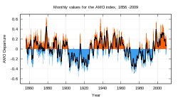 Sufficiently warm sea surface temperatures are considered vital to the development of tropical cyclones. Although neither study can directly link hurricanes with global warming, the increase in sea surface temperatures is believed to be due to both global warming and natural variability, e.g. the hypothesized Atlantic Multidecadal Oscillation (AMO), although an exact attribution has not been defined. However, recent temperatures are the warmest ever observed for many ocean basins.