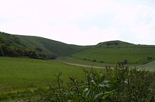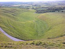 Some believe these terraces at the bottom of this valley are the result of medieval farming, or alternatively were used for early farming after being formed by natural processes. The steep sided dry valley below the horse is known as the Manger and legend says that the horse grazes there at night.