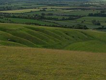 The Uffington White Horse is a highly stylized prehistoric hill figure, 110 m long (374 feet), formed from deep trenches filled with crushed white chalk. The figure is situated on the upper slopes of White Horse Hill in the English civil parish of Uffington (in the county of Oxfordshire, historically Berkshire), some 8 km (5 mi) south of the town of Faringdon and a similar distance west of the town of Wantage. The hill forms a part of the scarp of the Berkshire Downs and overlooks the Vale of White Horse to the north. Best views of the figure are obtained from the air, or from directly across the Vale, particularly around the villages of Great Coxwell, Longcot and Fernham. The site is owned and managed by the National Trust.