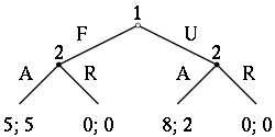 Extensive Form representation of a two proposal Ultimatum Game. Player 1 can offer a fair (F) or unfair (U) proposal; player 2 can accept (A) or reject (R).
