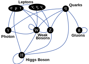The elementary particles from which the Universe is constructed. Six leptons and six quarks comprise most of the matter; for example, the protons and neutrons of atomic nuclei are composed of quarks, and the ubiquitous electron is a lepton. These particles interact via the gauge bosons shown in the middle row, each corresponding to a particular type of gauge symmetry. The Higgs boson is believed to confer mass on the particles with which it is connected. The graviton, a supposed gauge boson for gravity, is not shown.