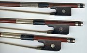 A violin is usually played using a bow consisting of a stick with a ribbon of horsehair strung between the tip and frog (or nut, or heel) at opposite ends. A typical violin bow may be 75 cm (29 inches) overall, and weigh about 60 g (2 oz). Viola bows may be about 5 mm (3/16") shorter and 10 g (1/3 oz) heavier.
