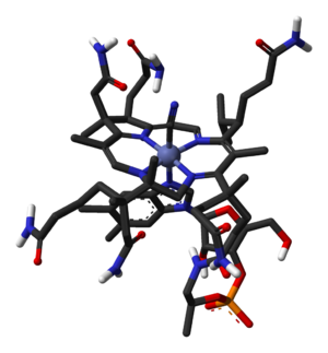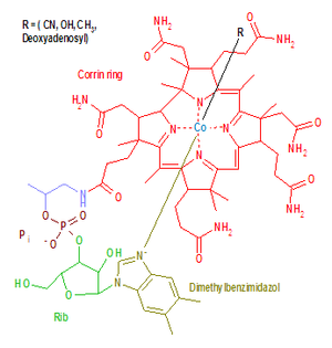 B-12 is the most chemically complex of all the vitamins. The structure of B-12 is based on a corrin ring, which is similar to the porphyrin ring found in heme, chlorophyll, and cytochrome. The central metal ion is Co (cobalt). Four of the six coordination sites are provided by the corrin ring, and a fifth by a dimethylbenzimidazole group. The sixth coordination site, the centre of reactivity, is variable, being a cyano group (-CN), a hydroxyl group (-OH), a methyl group (-CH3) or a 5'-deoxy adenosyl group (here the C5' atom of the deoxyribose forms the covalent bond with Co), respectively, to yield the four B-12 forms mentioned above. The covalent C-Co bond is one of first examples of carbon-metal bonds in biology. The hydrogenases and, by necessity, enzymes associated with cobalt utilization, involve metal-carbon bonds.