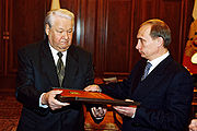 President Boris Yeltsin handing over the presidential copy of the Russian constitution to Vladimir Putin on 31 December 1999.