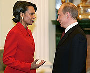 Condoleezza Rice speaks with Putin during her April 2005 trip to Russia.