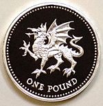 British one Pound coin (reverse) depicting the Welsh dragon