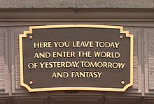 | “ | To all who come to this happy place; welcome. Disneyland is your land. Here age relives fond memories of the past .... and here youth may savor the challenge and promise of the future. Disneyland is dedicated to the ideals, the dreams and the hard facts that have created America ... with the hope that it will be a source of joy and inspiration to all the world. | ” |