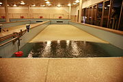 Water exiting the flocculation basin may enter the  sedimentation basin, also called a clarifier or settling basin. It is a large tank with slow flow, allowing floc to settle to the bottom. The sedimentation basin is best located close to the flocculation basin so the transit between does not permit settlement or floc break up. Sedimentation basins can be in the shape of a rectangle, where water flows from end to end, or circular where flow is from the centre outward. Sedimentation basin outflow is typically over a  weir so only a thin top layer - furthest from the sediment - exits.The amount of floc that settles out of the water is dependent on the time the water spends in the basin and the depth of the basin. The retention time of the water must therefore be balanced against the cost of a larger basin. The minimum clarifier retention time is normally 4 hours. A deep basin will allow more floc to settle out than a shallow basin. This is because large particles settle faster than smaller ones, so large particles bump into and integrate smaller particles as they settle. In effect, large particles sweep vertically though the basin and clean out smaller particles on their way to the bottom.
