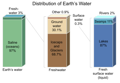97% of the water on the Earth is salt water. However, only three percent is fresh water; slightly over two thirds of this is frozen in glaciers and polar ice caps. The remaining unfrozen freshwater is found mainly as groundwater, with only a small fraction present above ground or in the air.