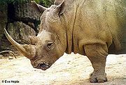 The White Rhinoceros or Square-lipped rhinoceros (Ceratotherium simum) is one of the five species of rhinoceros that still exist and is one of the few megafauna species left. Behind the elephant, it is probably the most massive remaining land animal in the world, along with the Indian Rhinoceros and the Hippopotamus, which are of comparable size. It is well known for its wide mouth used for grazing and for being the most social of all rhino species. The White Rhino is the most common of all rhinos and consists of two subspecies, with the northern subspecies being rarer than the southern. The northern subspecies may have as few as 50 remaining world wide.