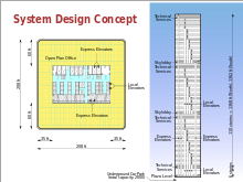 Of the 110 stories, eight were set aside for technical services in mechanical floors Level B5/B6 (floors 7/8, 41/42, 75/76, and 108/109), which are four two-floor areas that evenly spaced up the building. All the remaining floors were free for open-plan offices. Each floor of the towers had 40,000 square feet (3,700 m2) of space for occupancy. Each tower had 3,800,000 square feet (350,000 m2) of office space. Altogether the entire complex of seven buildings had 11,200,000 square feet (1,040,000 m2) of space.