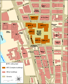 ![]() The first World Trade Centre of New York City in March 2001. The reddish-brown building (back left) is the original 7 World Trade Centre. The North Tower (left), with antenna spire, is 1 WTC. The South Tower (right) is 2 WTC. All 7 buildings are partially visible (see map below). Background shows the East River.  |