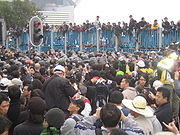 Protestors clashing with Hong Kong police in Wan Chai (area of Waterfront) during the WTO Ministerial Conference of 2005.