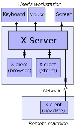Example deployment of X server: the X server receives input from a local keyboard and mouse and displays to a screen. A web browser and a terminal emulator run on the user's workstation and a software update application runs on a remote computer but is controlled and monitored from the user's machine
