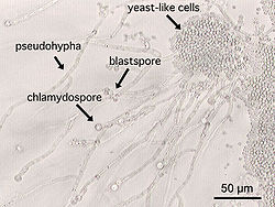 A photomicrograph of Candida albicans showing hyphal outgrowth and other morphological characteristics.