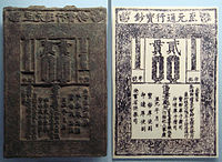 He issued paper banknotes known as Chao (鈔) in 1273. Paper currency had been issued and used in China before Yuan time; by 960, the Song Dynasty, short of copper for striking coins, issued the first generally circulating notes. However, during the Song Dynasty, paper money was used alongside the coins. On the other hand, Yuan was the first dynasty in China to use paper currency as the predominant circulating medium. The Yuan bureaucrats made paper bills from the mulberry bark paper.